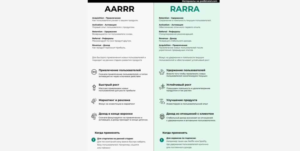 Читлист где разбираются две модели метрик AARRR и RARRA.