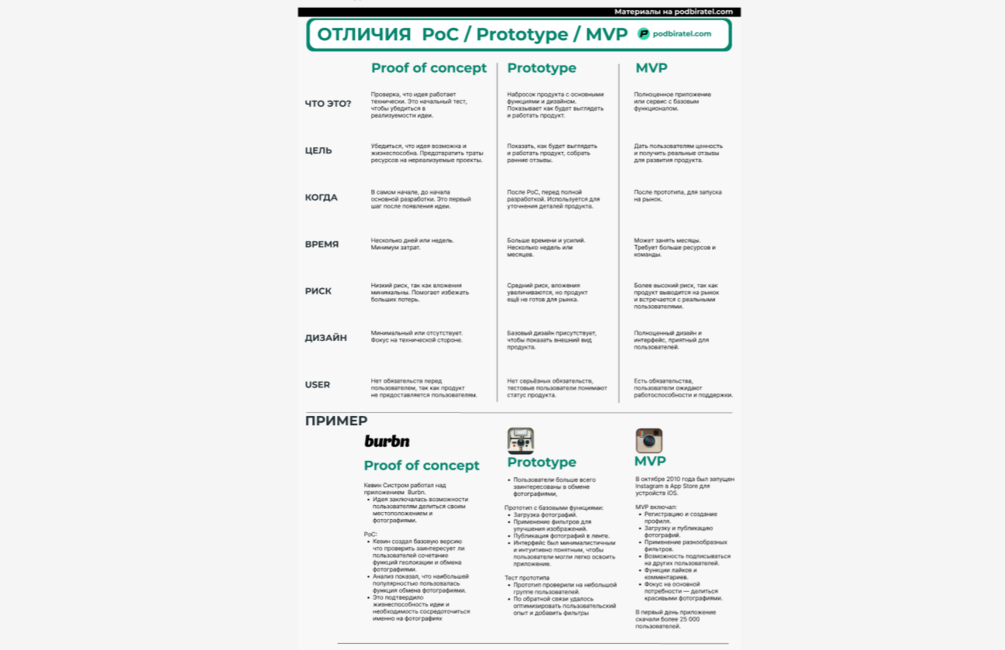 Читлист с отличиями и примерами по концепциями MVP, Proof of concept, Prototype